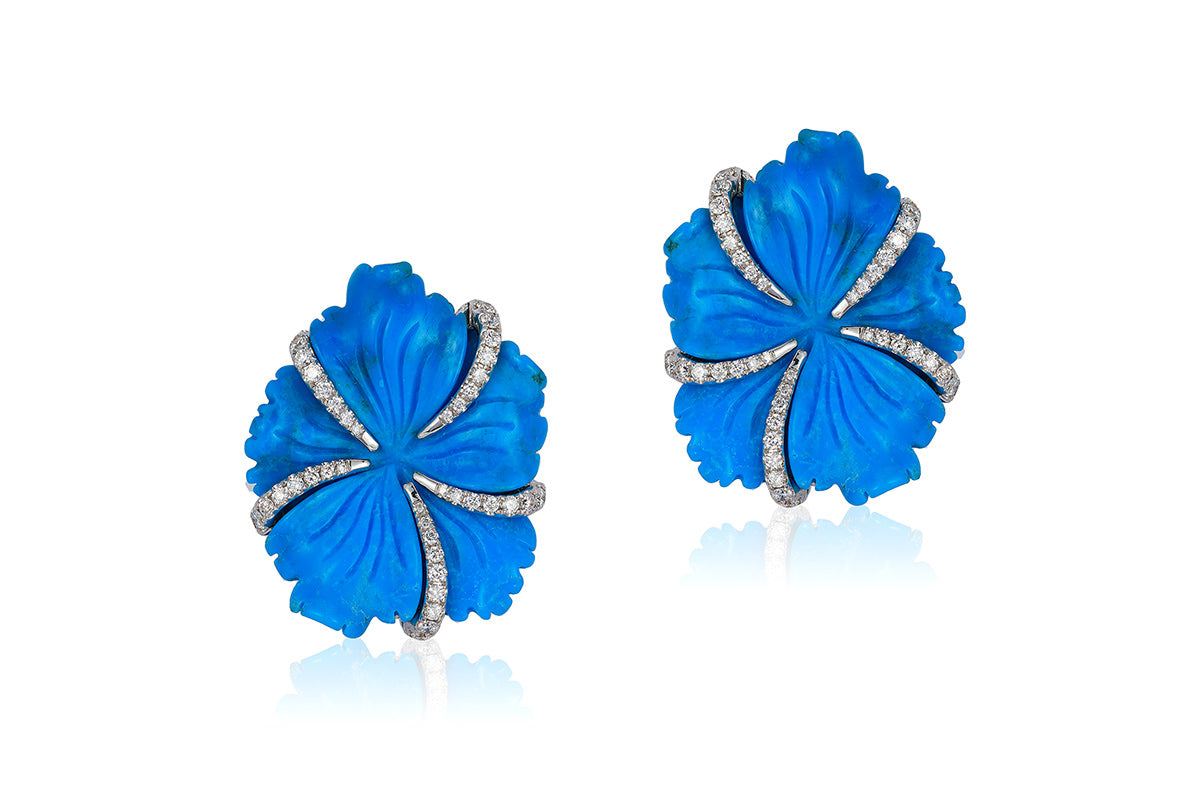 18K White Gold Goshwara Innate Carved Turquoise and Diamond Flower Earrings
