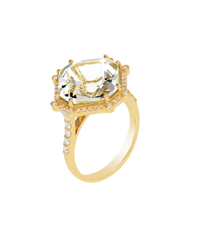 18K Yellow Gold Goshwara Rock Crystal Quartz and Diamond Gossip Ring